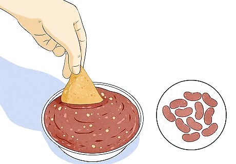 Make a bean dip instead of cheesy or salty salsa. Beans have protein in them that will make the snack more filling and less salty, and kids will love having baked tortilla chips, which feel like junk food.