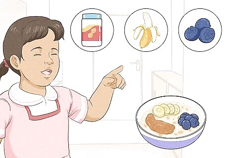 Make oatmeal and let your child customize it. Oatmeal is a great way to sneak fruits and calcium-rich milk or yogurt into the beginning of the day. You can also let your kids customize it to make it their own. Some options include: Cocoa powder. Dried or sliced fruit. Nuts Agave nectar, honey, or natural sugars (in moderation). Cinnamon or spices.