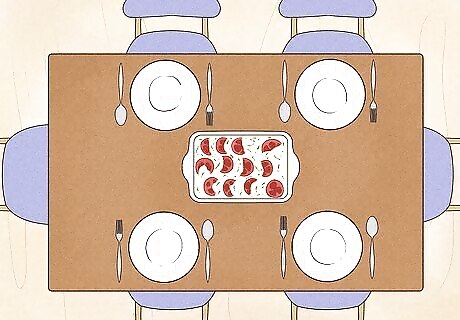 Serve food family style. Put your meal out on the table and let the kids choose what they want to eat, instead of cooking them a separate meal or putting everything on their plate for them. Kids love to feel like they are in charge of their own decisions, and will likely model their behavior after you. It also lets them put as much of a new food on their plate as they want to sample before coming back for seconds. Ask them to put at least one of everything on their plate, but let them choose the amount. Serve yourself first so that they can see how much of each food you take.