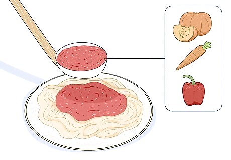 Mix vegetables into pasta dishes. Try using a hand blender to puree some squash, carrots, or peppers into red sauce, or saute finely chopped onions and zucchini and add them in with the pasta before serving. No one will notice, but the added vegetables are key for a healthy diet. Switching to whole-grain pasta is a great way to get more fiber into your daily diet.