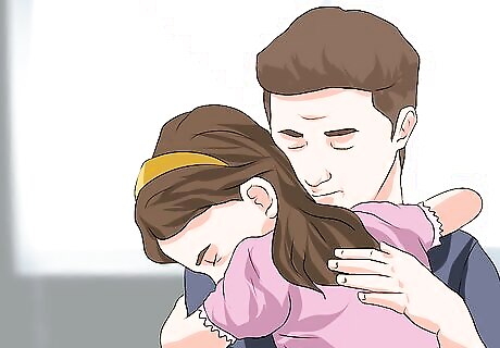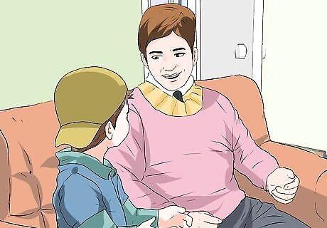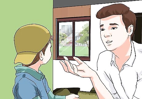 Get down to the child’s eye level. Imagine being a child and having someone much bigger looking down to talk to you. It can be intimidating. When you get down to your child’s height, you’re literally putting yourself on their level, which is a great way to start. Don’t attempt to have a conversation or give a child instructions from another room. It might seem easier to yell from upstairs, but it actually makes communication much harder. You can also sit together at a table or on a couch if that’s comfortable.