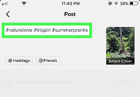 Use hashtags effectively. When you post a video that features a cat and cucumber, make sure you use accurate hashtags, like #cat and #cucumber. If you correctly used hashtags, your video should appear in the search results for people who search for "cats." By correctly using hashtags, you are enabling your video to show up in searches that could mean potential views. You have the option to add hashtags when you're prompted to add a description to your post. Tap # Hashtags to start tagging.