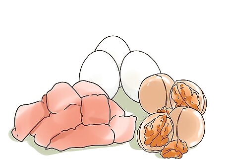 Get plenty of protein. High protein offerings should comprise a substantial part of your normal food intake. Choose lean meats like skinless grilled chicken, steak and fish, along with protein sources that also contain healthy fats, like eggs, nuts and legumes. When you supply your body with protein, it enables it to build and maintain lean muscle mass, which burns calories, makes you feel stronger and more energetic and improves your overall appearance. The average adult needs somewhere from 50-70g of protein per day. Most of this should be received from natural food sources. Take a protein supplement, like a shake or bar, along with your regular meals if you’re having meeting your protein requirements.