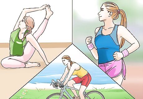 Enjoy an active hobby. Even if you lack the means or the motivation to make it to the gym, you can find healthy ways to be physical and rid troublesome areas of unwanted fat. As often as you can, get out and go for a jog, swim or bike ride. Take some yoga classes, go kayaking or toss a frisbee at the park. Taking part in a sport or pastime you actually have fun doing makes you more likely to get active, and stick with it. Finding a friend to join you in an activity can make it more enjoyable. Since you’re trying to target cellulite in the thigh area, make sure your physical pursuits require you to use your legs extensively.