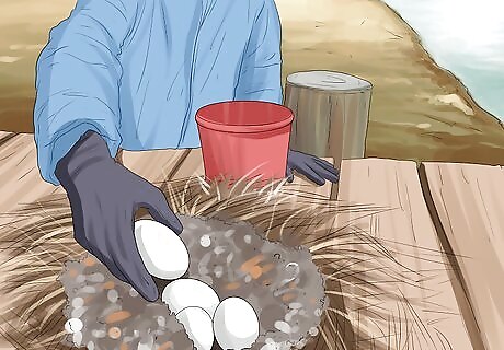 Remove eggs from the nest. Another way to addle eggs is to remove them from the nest within the 14 day incubation time. Dispose of eggs according to the guidelines provided by the U.S.F.W. Your state may have other requirements for disposing of goose eggs. Consuming goose eggs is illegal, as is trading, buying, or selling. Once the eggs have been removed, you can scatter the nesting material to discourage geese from using the nest again.