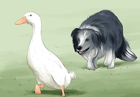 Use a goose-herding dog. Border collies and other herding breeds can be trained to scare geese away from an area. The geese will perceive the dog as a predator and may be convinced to leave the area for good. Only dogs that have been specially trained by a handler should be used to scare geese away. Do not let the dogs catch or harm the geese. If not specially trained, the dogs may cause the geese to re-locate to the water, where the dog will not pose a real threat. If the geese are nesting or raising young, do not attempt to scare them away with a dog.