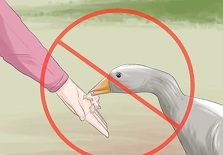 Avoid feeding geese. Feeding geese can attract more to your property. If they know they can get food from you, they will gather on your lawn. Human food is not healthy for geese. Even if the geese are in a public place, such as a park, refrain from feeding them. Geese are easily domesticated, especially if they are getting most of their food from you. You may want to construct signage in your area letting others know not to feed the geese.
