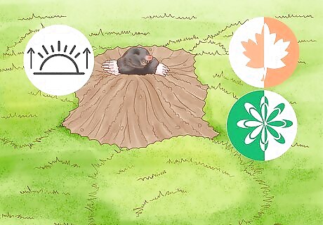 Observe your yard. Moles are most active in the spring or fall. To spot one, observe your yard in the early morning or evening. While moles only tend to appear above ground surface when they are looking for a mate, you might observe active signs of their tunnelling (e.g. dirt being tossed, grass moving). Moles are also likely to appear outdoors after a warm rain, when things are moist and temperate.
