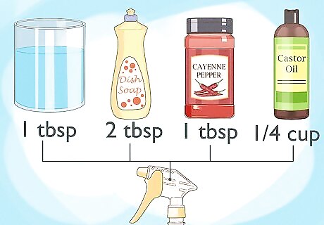 Make a natural mole repellent spray. To make a harm-free, mole repelling spray, combine 1/4 cup (2 oz) of castor oil, 1 tbsp. (0.5 oz) of cayenne pepper, and 2 tbsp. of liquid dish detergent in a large bowl or container. Add 1 tbsp. (0.5 oz) of water and stir, then pour the mixture in a container to store. When needed, mix 2 tbsp. (1 oz) of the mixture to a gallon of water and fill a spray bottle. Spray mounds, raised ridges, and the surrounding area of your yard. Castor oil, a powerful mole repellent, can also be effective when applied to the soil on its own.