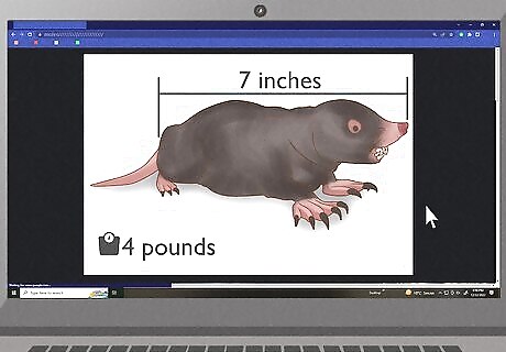 Look at pictures of moles. Look online for pictures of moles to know exactly what you are looking for in your yard. They are small mammals with front flippers, webbed feet, no visible ears, and a pointed, bald snout. Moles are typically only 7 inches long (approximately 18 cm) and weigh about 4 pounds.