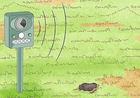 Try an ultrasonic device. Another harm-free mole deterrent option might be an ultrasonic device emitting an underground sonic pulse to repel moles and other underground rodents (e.g. gophers). The penetrating vibrations will not affect you or your house pets, but will effectively deter pests from tunneling nearby. The Molechaser, for instance, is a small, waterproof, battery-operated spike that can be inserted into the ground to repel underground rodents, and is available online for approximately $25.