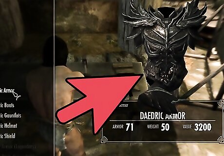 Equip the armor. Open your character’s bag and select the Daedric armor pieces. Using your controller’s navigation buttons, equip each item of the set one at a time.