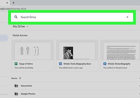 Use the “Search Drive” bar to find files in your Drive. If you have a large number of files in your Drive, and especially if they aren’t particularly well-organized, Drive’s search bar can be very useful. Do a basic search by typing in terms associated with the file you’re looking for, or click the down-facing arrow at the far right of the search bar to reveal advanced searching options. If you want to identify all your files of a specific type—for instance, all your PDFs—enter file:pdf into the search bar.