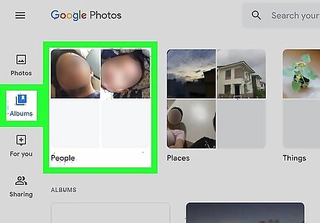 Search through all your Google Photos images and videos by person. Open Google Photos, then click on the “Albums” tab along the left side. Click on the “People” icon to go to a group of facial image icons, each representing one person. Click on one of the faces to see all the photos and videos you have that include that person. Google Photos will frequently ask you to help it out by confirming whether 2 facial images are of the same person. The more often you go through this process, the more accurate the groupings by person become.