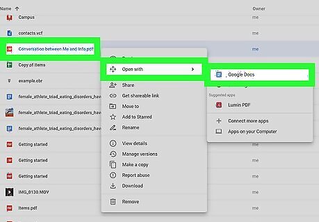 Scan, convert, or translate files with a few clicks. To quickly convert an image or PDF file to a Google Docs file, right click on the file name in your Drive directory. Click “Open with” and select “Google Docs.” To translate an open Google Docs file, click on the “Tools” menu, select “Translate document,” and choose a language from the drop-down list. You can scan files or images to Drive with your Android smartphone if you have the Google Drive app installed. Open the app, click the plus sign (+) tab at the bottom right of the screen, and follow the prompts to scan the item.