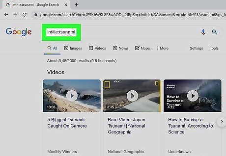 Specify your search by site, title, text, URL, or file type. There are actually a wide range of “specifiers” you can add to your search in order to limit your results. They all follow a similar format—using the specifier term with a colon (:) after it. Some of the most helpful examples include the following: intitle: followed by a search term searches only the titles of webpages for that term (e.g., intitle:tsunami). intext: followed by a search terms checks only the text within webpages. inurl: followed by a search term searches only within URLs. filetype: preceded by a search term and followed by the file type you want (such as PDF) searches only those file types (e.g., narwhal filetype:pdf). site: preceded by a search term and followed by a specific website URL searches only within that website (e.g., turmeric site:wikihow.com).