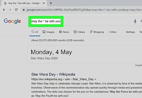 Type (*) as a placeholder if you forget part of a quote or lyric. Google Search is often able to “fill in the blanks” for you. Use a single asterisk (*) per word that you’ve forgotten or don’t know. For example, may the * be with you produces many Star Wars related results, while may your * be merry and bright reveals results related to the holiday classic song “White Christmas.”