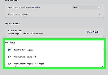 Set the startup tabs for each time you open Chrome. Click on the 3-dot symbol at the top right of the browser window, then select “Settings.” Scroll down to the “On startup” section. You can select to start each new Chrome session by restoring your previous tabs, opening a blank tab, or opening a specific set of tabs. For example, if you end up on wikiHow all the time, you can set wikihow.com as the startup tab every time you open Chrome.