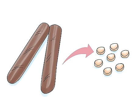 Use small, aromatic treats to train your dog. You should break up treats into pea-sized pieces when training your dog, since training sessions will typically involve 10 to 20 repetitions of a command. Use aromatic treats, like bits of hot dog, cooked meat, cheese, or a favorite store bought treat. Go for soft treats that can be eaten quickly when training your dog commands and tricks. Cut treats into bite-sized pieces. Make sure that they are easy for your dog to eat, but not so small that they could choke on them.
