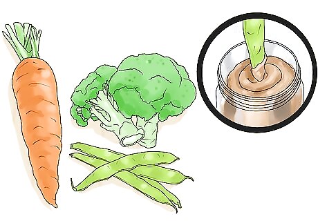 Try using fresh veggies. Carrots, broccoli, and green beans can be excellent, healthy treat options. These fresh veggies are low in calories and high in fiber, and most dogs enjoy them as treats. Consider dipping veggies in a bit of peanut butter for a higher value treat.