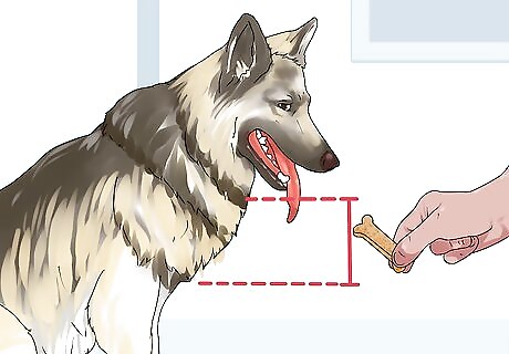 Hold treats near your dog’s chest. When you offer your dog a treat, be sure to hold it at the dog’s chest or under its mouth and eye level. Holding a treat too high or waving it above the dog’s head encourages jumping and over excitement . If your dog jumps at a treat outside of its visual range, it’ll have less control over its teeth and might nip your finger. If you toss your dog a treat, toss it gently on the ground in front of your dog instead of in the air to discourage jumping.