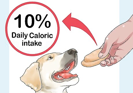 Limit treats to less than 10% of your dog’s diet. Giving your dog too many treats a day can lead to weight gain and obesity-related health issues. Check labels so you know how many calories one treat contains, and ask your dog’s vet what its daily caloric intake should be. For example, suppose your 20 pound dog should ingest 700 calories a day and you have treats that are each 100 calories. You should break the treats in smaller pieces and try to offer a daily total that’s about a third less than one full treat. Table scraps can skyrocket your dog’s treat calories and add lots of unnecessary fat and sugar to its diet, so limit its consumption of scraps from your plate. If you notice your dog starting to gain weight around their tail, head, hips, or behind the shoulders, scale back food-based treats. Try using toys and play time as a reward instead.