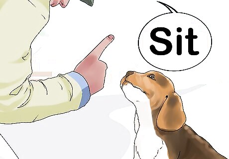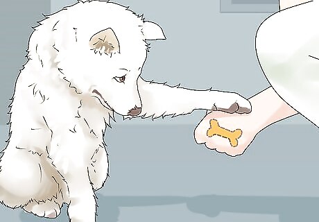 Teach your dog command words. To teach your dog a command, first say the command word, like “Sit.” Show your dog the treat, and if necessary, physically guide your dog into the appropriate position. Give your dog the treat as soon as it’s in the correct position to teach it to associate that action with a reward. It’s essential to give the treat within a second or two of the proper action so your dog understands the connection between the action and the reward. Keep command words short and use words and tones of voice consistently whenever you give commands. Once you’ve taught it a few basic commands, like sit and come, you can use the same method to teach it other tricks, like shake or high five.