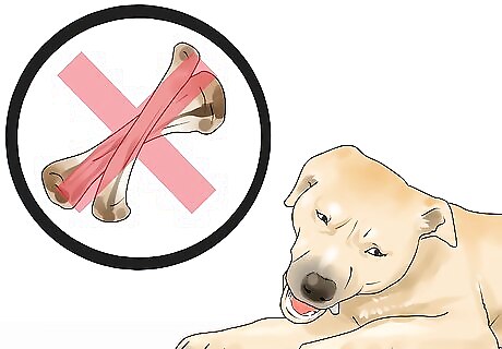 Avoid offering your dog cooked bones. Cooked bones, particularly cooked chicken bones, can splinter when your dog chews on them. These small shards present a choking hazard and can damage the throat or intestines. If you want to offer your dog bones, choose marrow bones cut to at least two inches in length to prevent choking. Freezing them beforehand will make them harder. They’ll be more appealing that way and will also clean your dog’s teeth.
