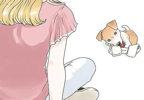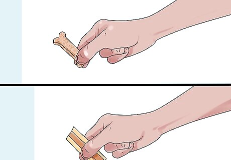 Teach your dog to take treats gently. If you find that your dog impatiently grabs treats from you, you should train it to be patient and gentle. First, hold a treat in front of your dog with a closed fist. If it paws or bites to get the treat, keep your fist closed. Wait for your dog to calm down or softly touch your fist with its nose, then completely open your hand to allow it to eat the treat off your palm. Repeat this sequence to reinforce your dog’s association of calm, gentle touching with a reward. Try using a garden glove to protect your hand, especially if you have sensitive or thin skin.