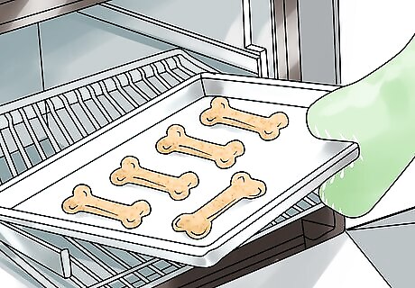 Make your own treats. In addition to store bought treats, you can make easy treats for your dog at home. When you make homemade treats and food, it’s always a good idea to check with your dog’s vet to rule out potential allergies and other complications. Try simmering chicken and water in a slow cooker on low for eight hours. Shred large pieces and stir the pot, then ladle the mixture into cups or an ice cube tray. Freeze overnight to create a hydrating summertime treat. Combine two parts apple pulp, one part peanut butter, one part brown sugar, and a spoonful of ground flax in a mixing bowl. Knead and add water to form dough, three spoonfuls or so. Portion out treat-sized bits, place them on a cookie sheet, and bake at 350 degrees Fahrenheit (180 degrees Celsius) for 20 minutes. Look online for fun dog treat recipes. With a little searching, you can find recipes for not only dog biscuits, but treats like cakes, cupcakes, and cookies for your furry friend. Just double check to make sure the recipes call for whole ingredients and that the ingredients are safe for dogs.