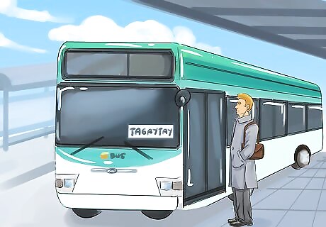 Travel to Tagaytay by bus for a cheaper journey. There are buses that travel from Manila to Tagaytay roughly every 30 minutes during the day. Travel to the Cubao Bus Terminal in the Quezon City area of Manila and look for a bus sign marked Nagabus-Tagaytay to find an appropriate bus. A bus journey to Tagaytay will usually cost around 120 pesos. Try to avoid catching a bus in the early morning or later afternoon, as this is when the buses will be busiest. The trip from Manila to Tagaytay will take between 2 to 4 hours, depending on the traffic.