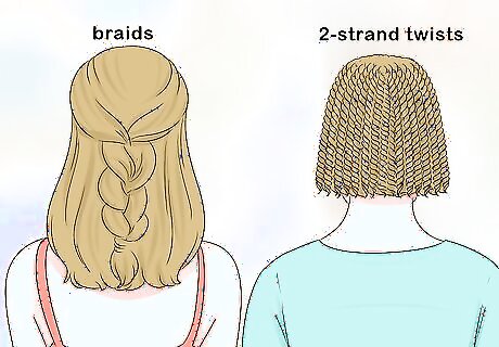 Choose a low-manipulation style. A complicated hairstyle that requires a lot of pulling, combing, or the use of heat styling tools on your hair can cause damage. Instead, choose a style that doesn’t involve a lot of manipulation. Braids, and 2-strand twists are protective styles that keep allow your hair to breathe and don’t require combing or running your hands through your hair.