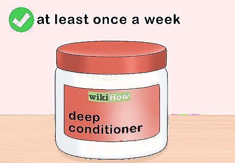 Use a deep conditioner at least once a week. Conditioning daily or every few days is great, but deep conditioning is helpful for adding even more moisture to your hair. A deep conditioner can be bought at any beauty supply store and at some supermarkets with a beauty section. Leave the deep conditioner on for anywhere between 5 and 30 minutes. Then, rinse it out with water. Rinse the conditioner out with cool water to lock in the moisture and seal the hair's cuticle. If possible, sit under a hooded dryer while you deep condition for 30 to 45 minutes. The dryer will help condition your hair even more.