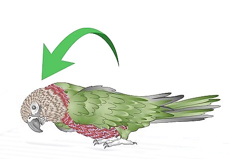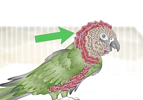 Look for an extended neck fan. One of the unique features of the hawk-headed parrot is the fan of blue and red feathers behind the head. Hawk-headed parrots will often display this fan in order to establish dominance and make themselves appear larger when they are feeling threatened. A raised feather fan is a sign that your hawk-headed parrot is feeling angry or defensive, and should not be handled.