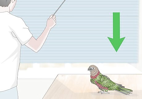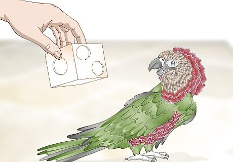 Distract your parrot. If your hawk-headed parrot is acting aggressive, sometimes a distraction will take its mind off of whatever is upsetting it. For example, if your hawk-headed parrot is putting on a threat display or trying to bite you when you hold or pet it, put it down on its play gym or offer a toy instead.