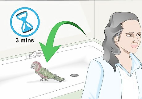 Put your parrot in “time-out.” If your parrot won’t stop biting, lunging, or engaging in other aggressive behaviors, try isolating it in a dark space for no longer than three minutes. For example, you might calmly set your parrot down in an empty bathtub, turn off the light, and leave the bathroom for three minutes. After you do this two or three times, your parrot will learn that unwanted behaviors result in being separated from you. Try getting your parrot to associate this type of isolation with a word or phrase, like “jail” or “time-out.” Your parrot may eventually stop doing the unwanted behavior as soon as you say the word.