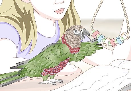 Socialize with your parrot every day. Hawk-headed parrots are extremely social birds, and they need to interact with humans regularly in order to stay happy and well-adjusted. If you play and socialize with your parrot for a few hours every day, it will feel more trusting and relaxed around you, and aggressive behaviors will be less likely.