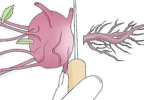 Cut the roots off the bulb. Once you have removed the plant, cut off the roots at the base of the bulb with your serrated knife. The bulb is the most important part of your kohlrabi harvest. The roots are inedible and hold a lot of soil. Remove the roots while you're still in the garden and put them in your garden compost.