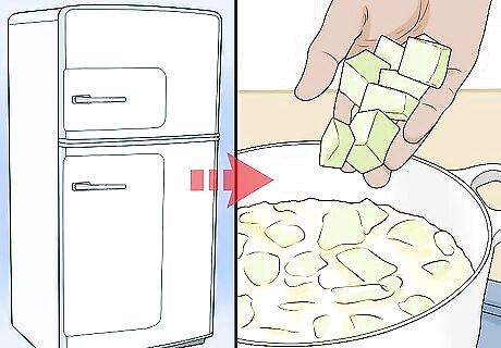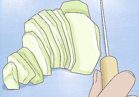 Cut your kohlrabi into slices or cubes to eat. Cut the kohlrabi bulb in half and remove the tough core. Cut into slices to eat raw or add to a salad. Kohlrabi is crisp, sweet and delicious when eaten raw. Cut into cubes to roast. This brings out the the sweetness in the kohlrabi. Steam the kohlrabi with other root vegetables. You can even use kohlrabi as a potato substitute in a mash!