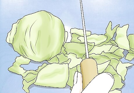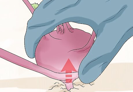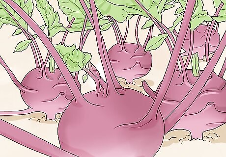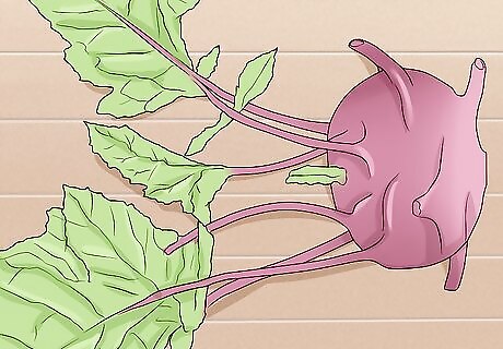 Pull the kohlrabi plant out of the soil. To remove the kohlrabi grab the base of the leaves where they connect to the bulb. Hold on to the leaves and pull the plant upward. This should remove your kohlrabi plant from the soil. You may need to use a bit of force if your plants have grown bigger. Shake off any excess soil from the roots.