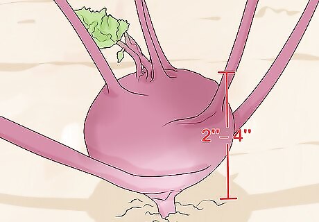 Harvest your kohlrabi when the bulbs are 2–4 inches (7–10 cm). The smaller bulbs are the sweetest. Pick the bulbs that are the size of a golf ball. The bulb sits on the top of the soil so it's easy to check. Remove your kohlrabi before they are the size of a tennis ball. The larger the kohlrabi bulb gets, the more woody and tough it is to eat.