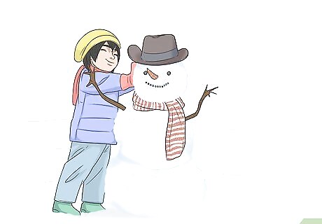 Make a snowman or other creatures. Build a snowman, a snow family, or snow animals like a cat, dog, bird, or caterpillar! Use sticks, pine cones, rocks, and anything else you can find in nature to make faces for your snow creatures, or grab some buttons, hats, and scarves from inside to dress them up.