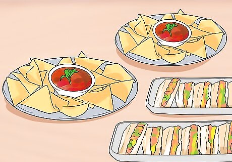 Have some snacks ready. Before your guests arrive, make sure you have some snacks set out for them to munch on while they’re waiting for everyone else to show up. Some good options include chips and dip, party trays, pizza, and small sandwiches. If your parents will let you, order snacks or appetizers from your favorite restaurant. Double check that your friends aren’t allergic to any of the snacks you’ve set out. It’s a good idea to have some vegetarian options as well, in case any of your friends don’t eat meat.