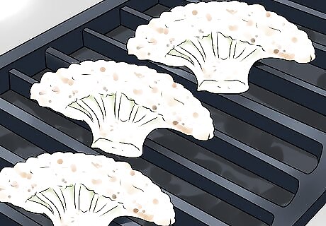 Aid digestion with grilled cauliflower. Take a head of cauliflower, rub it down with a mix of a few tablespoons of olive oil, lemon juice, salt, and pepper, and wrap the head completely in foil. Then, grill over indirect medium heat for about 40 minutes or until tender. You can also slice the cauliflower into “steaks” and cook it on a grill, like you would a cut of meat. Grilled cauliflower can help add fiber and necessary roughage to cookouts or other heavy-eating events, and is easy to prepare and share with others. Look to grilled cauliflower as a substitute for heavier cookout side dishes that tend to be high in calories, fats, and carbohydrates but relatively low in micronutrients.