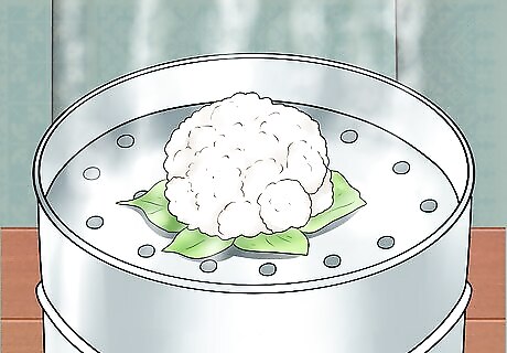 Steam your cauliflower. Steaming is good way to cook your cauliflower until it is tender enough to eat but still maintains many of the veggie’s great health benefits. Steam your cauliflower by placing raw or frozen florets in a steamer with lid and placing over a pot of boiling water for seven to ten minutes, until slightly tender. Steamed cauliflower is easily dressed with a bit of olive oil, balsamic vinegar, and/or fresh herbs such as garlic, rosemary, and thyme. Generally, if it works on a potato it will taste good on cauliflower. Steaming cauliflower has a minimal impact on the health benefits of the vegetable, and one of the easier ways to prepare the food while keeping it nutritionally sound. Have half a cup as part of a nutritionally balanced meal to get micronutrients such as vitamin C that you need for full body health.