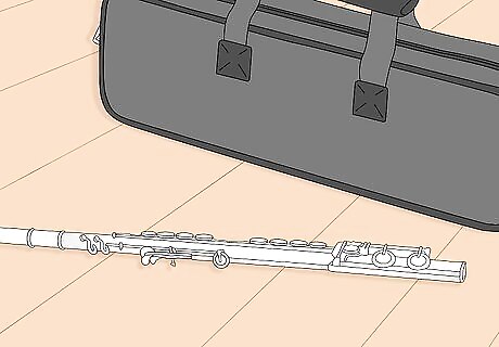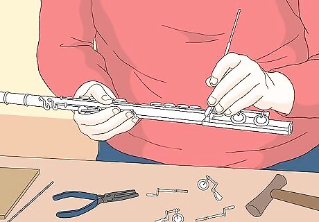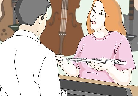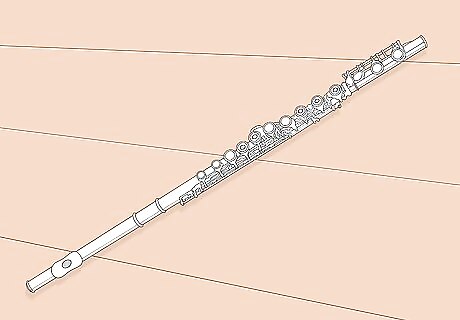 Choose a flute with well-crafted pieces. There are many components that allow a flute to work, but in particular, look for flutes with open key holes, an in-line G key, a B foot, a gizmo key, and a split E mechanism. Open hole keys: These allow the air to go through when uncovered, and this leads to a fuller, more resonant tone. The open holes also create less air resistance, so it is easier to play notes. This is highly recommended, but it will take some adjustment once you switch because you will have to cover the holes completely with your fingers. Start out with plugs in the keys that are hardest to reach, so you can play normally, and work at playing without the plugs while you practice. In line G key: This is a matter of personal preference and won't really affect the tone. An in line G key just means that one key will be a bit harder to reach (see the image to the right). If you have small hands or are used to playing with an offset G key, it is fine to stick with that. The main reason an in line G key is preferred is for the pleasing look of the keys. B foot: You can purchase a foot joint with a few extra keys that enables you to play one chromatic step lower than usual (a B). This is a good idea because you will probably come across the note in advanced flute literature. A flute with a B foot can also produce fuller tones than the same one with a C foot. Gizmo key: This key will almost always be included in a B foot and makes it easier to play high C or C# (5+ ledger lines). Split E Mechanism: A split E mechanism divides the action of the upper and lower G keys. Normally the G keys close together; in a split E mechanism, that is still true, but the lower G can close when the third octave E natural is played. This provides ideal tone hole venting for the high E and can improve tuning and tone for a flutist.
