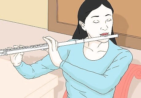 Experiment. You won't find your ideal tone until you know what all the options are! Furthermore, the meaning of a "good" flute tone depends on the music you're playing, and skilled musicians know how to vary their tone color (rich, bright, mellow, sweet, intense, haunting, etc.) to suit the mood they want to create. To practice this, pick a note you can play comfortably, hold it, and explore the following movements. As you play, notice how the sound changes, whether it seems more or less pleasing, and what types of musical moods it might evoke. Over time you can learn to pick the tone color you want and immediately find the position of your lips, jaw and body to produce it. Move the end of your flute higher and lower. This changes the angle of the air across the embouchure hole. Many flutists let their right arm drop too far for optimal tone and this exercise will show you if you're one of them. Move the end of your flute forward and backward. This also changes the angle of the air stream. Listen for the place where it sounds the most focused. Tilt your head left, right, forward and back. Feel what's most comfortable and sounds clearest. Roll the mouthpiece in and out. This changes how much air enters the flute and also affects pitch (whether you're flat, sharp, or just right). Direct your airstream higher or lower by moving your jaw forward and back. This affect can be similar to rolling the mouthpiece in or out. Make the muscles in your lips, cheeks and jaw more relaxed and less relaxed.