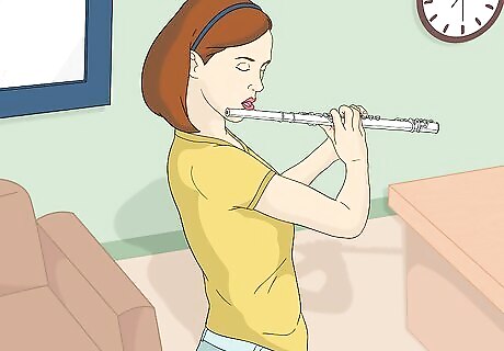 Breathe correctly. Take a deep breath starting with your belly, not your chest, before playing. You should see your belly physically expand. Your back should expand too toward the end of a deep breath. If your chest is the first thing to expand, or your shoulders rise upward when you breath, you are not getting as much air as you could. Your lips should also make a triangular gap when blowing. One way to practice this is to bend forward at the waist, making a 90 degree angle between your legs and torso. Then take a deep breath starting from your belly, feeling your entire belly and back expand before your chest does.