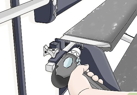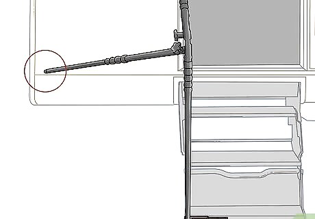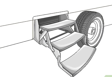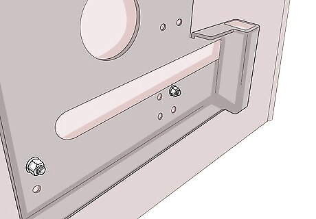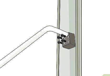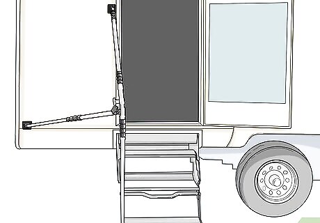Position the third leg so it is level with the bottom of the door frame. Combination rails have an extra arm to screw to the RV for extra stability. Swing the arm out from the handrail, moving it towards the back end of the RV. Make sure it’s level with either the door frame of the RV’s interior flooring. If it’s in the wrong spot, the rail may feel a little wobbly while you’re using it. If you have an RV that opens in the back, attach the third arm to any solid spot you can find. Try placing it on the kick panel, the strip of material right between the door frame and bumper.
