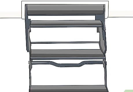 Position the bracket in front of the bottom step. Combination rails usually have a small lower bracket that fits on the front edge of the lowest step. Align it with the edge and side of the step. Make sure it is positioned no more than 1 in (2.5 cm) to the right or left of the door so that you will have room for the upper bracket. You can place the rail on either side of the steps, but it typically fits well on the right.